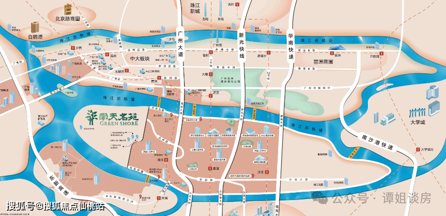 1、项目地处的洛溪岛,是继二沙岛之后,市中心第二个中轴岛,三江汇聚,处于城市中轴与珠江后航道的交汇处;
