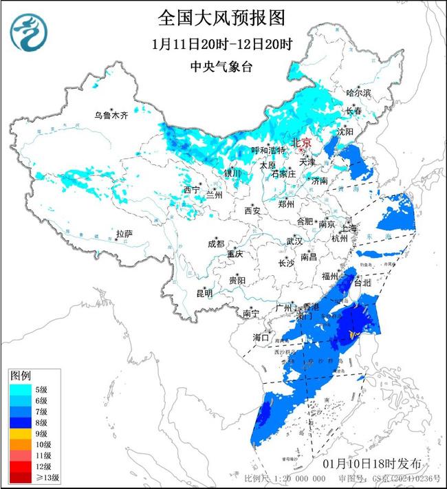 1月11日20时至12日20时,内蒙古、甘肃西部、宁夏北部、华北北部、山东半岛、辽东半岛等地部分地区有5~6级大风、阵风7~9级;渤海、渤海海峡、黄海北部和中部海域、东海大部海域、台湾海峡、巴士海峡、南海大部海域将有7~8级、阵风9级的大风,其中,巴士海峡、南海东北部部分海域的风力可达9级、阵风10级。