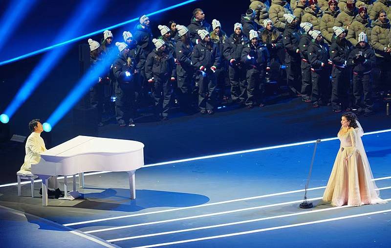 郎朗指尖流淌的悠扬琴音,与波切利在20米悬浮冰环上唱响的《今夜无人入睡》、凯莉极具穿透力的《Hero》海豚音完美交融,当歌声飙至最高音时,LED地面“裂开”流淌圣火光影。这一震撼场景成为全球社交媒体热议的焦点。钢琴声中融入《茉莉花》旋律,架起了中西方文化对话的桥梁。