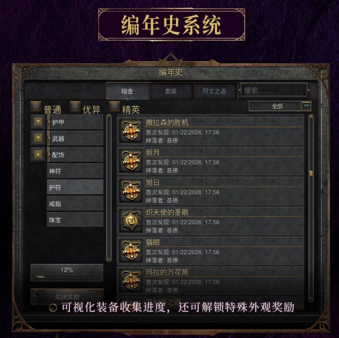 首先是“编年史”,对于喜欢收集全物品的玩家,现在可以追踪并记录你获得每件珍贵装备的时刻。